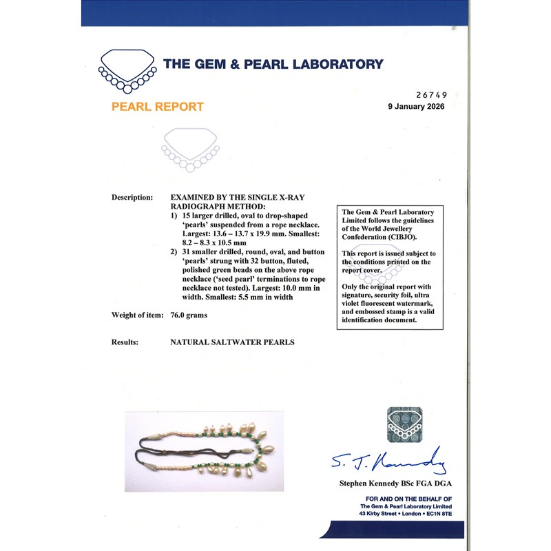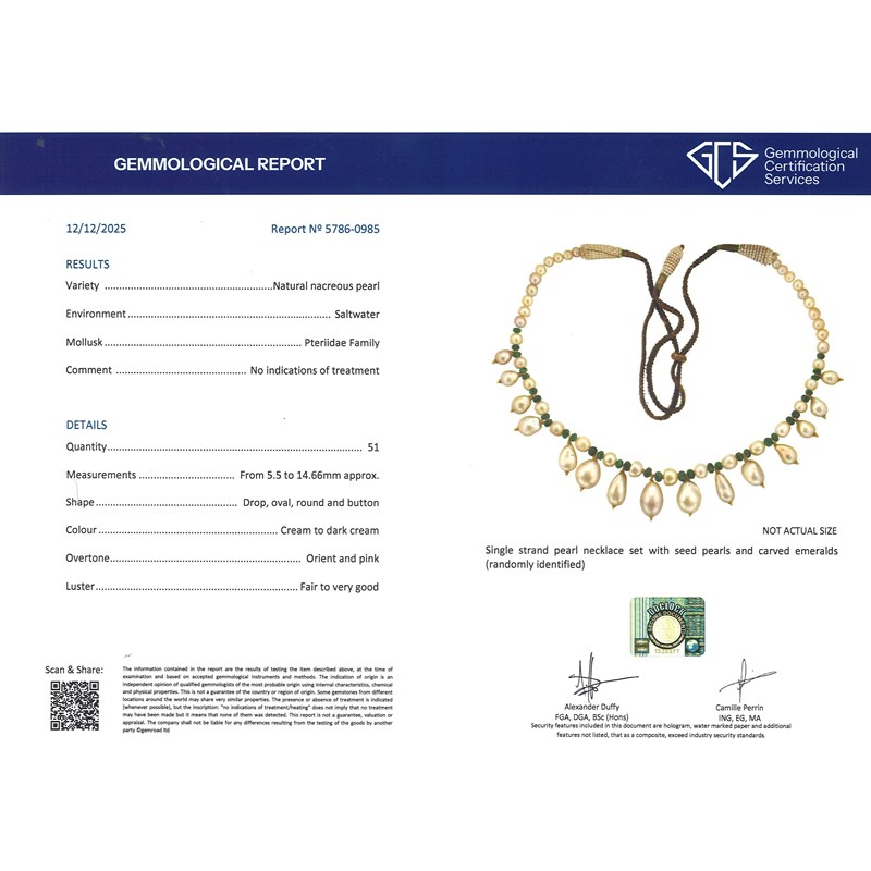 Accompanied by report number 5786-0985 from GCS, dated 12th December 2025, stating that the pearls are natural saltwater