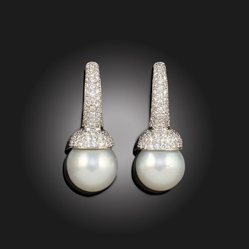 A PAIR OF CULTURED PEARL AND DIAMOND DROP EARRINGS
