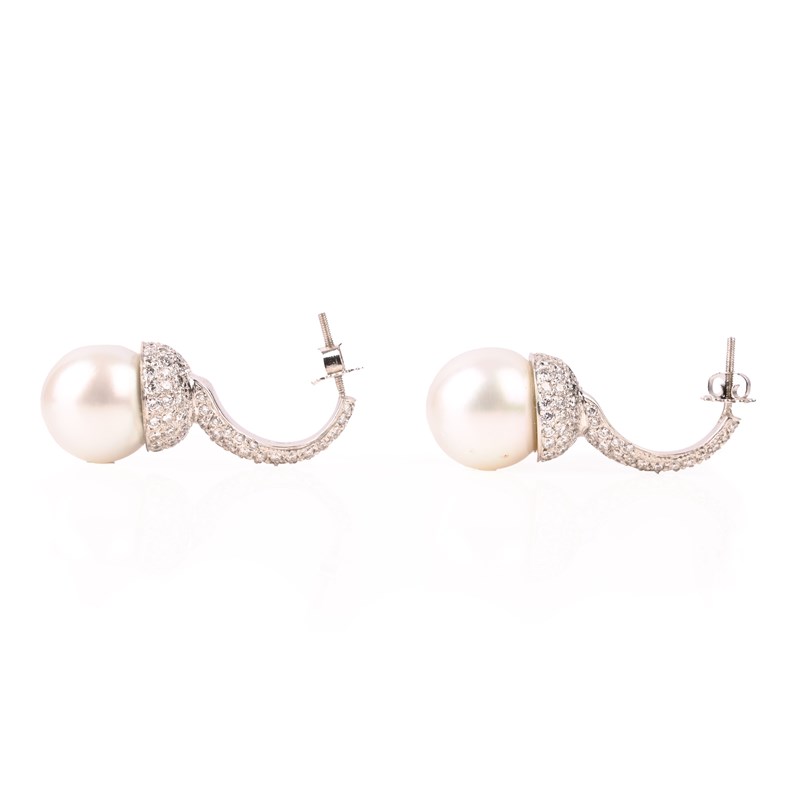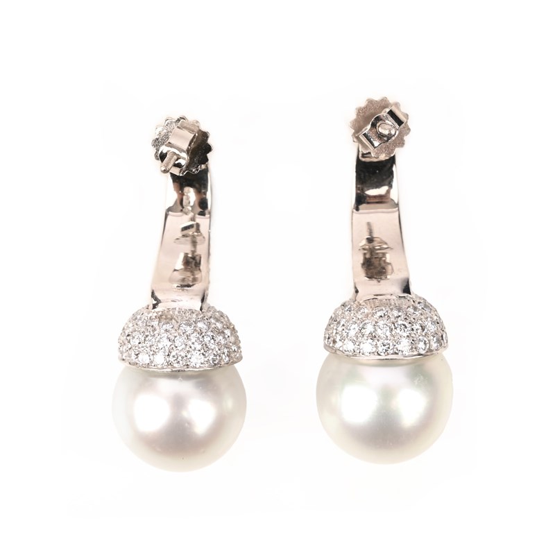A PAIR OF CULTURED PEARL AND DIAMOND DROP EARRINGS, designed as hoops pavé-set with graduated round brilliant-cut diamonds above a diamond cap suspending a cultured pearl, in 18ct white gold, post fittings, length 3.2cm