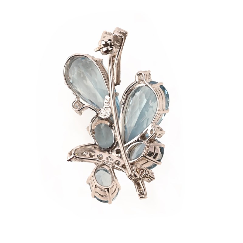 AN AQUAMARINE AND DIAMOND BROOCH, designed as a stylised spray, set with pear and oval-shaped aquamarines and round brilliant-cut diamonds, mounted in white gold, stamped 750, width 3.7cm, gross weight 10g
