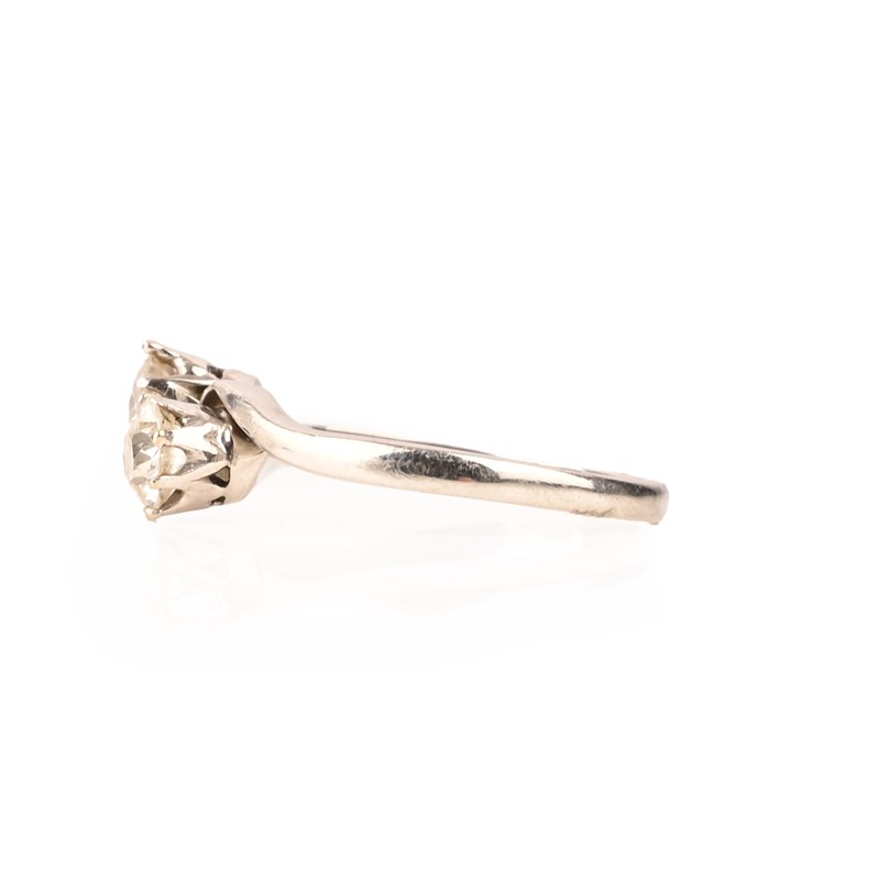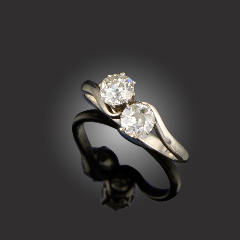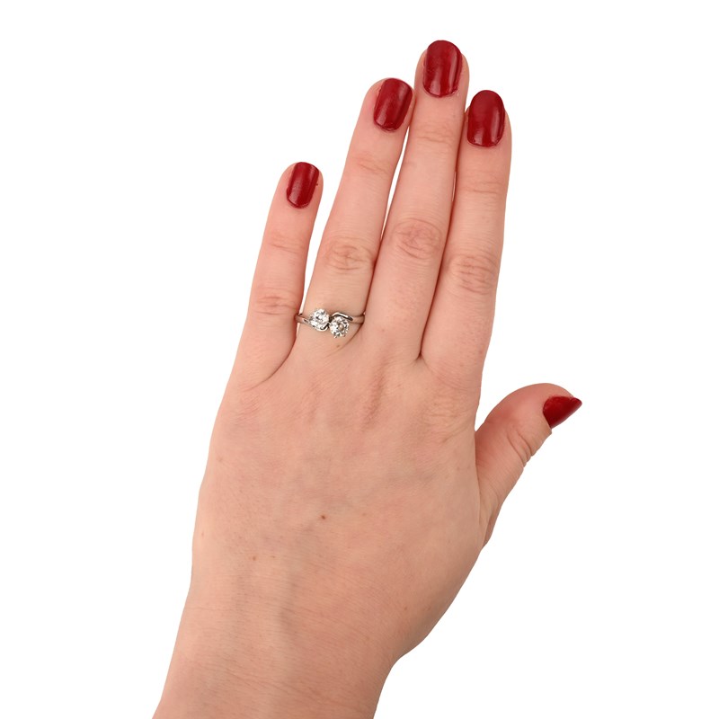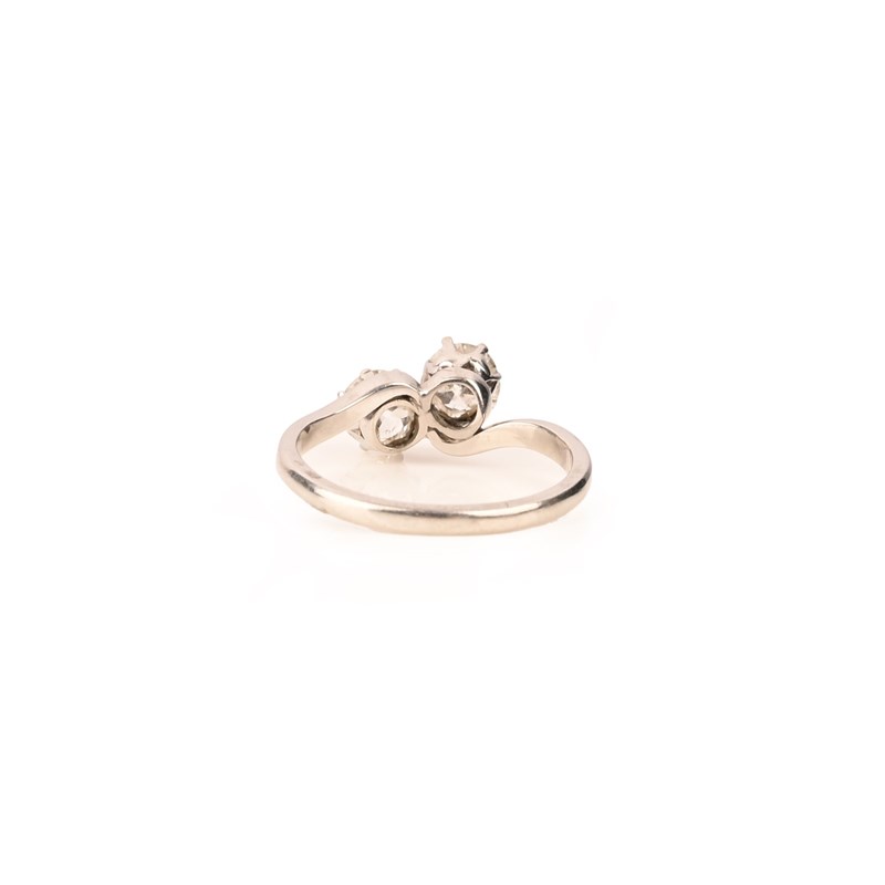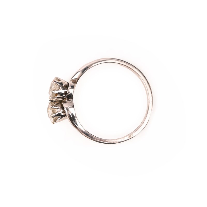 A DIAMOND CROSSOVER RING, set with two old circular-cut diamonds in platinum, total approximate diamond weight 1.00cts, size O