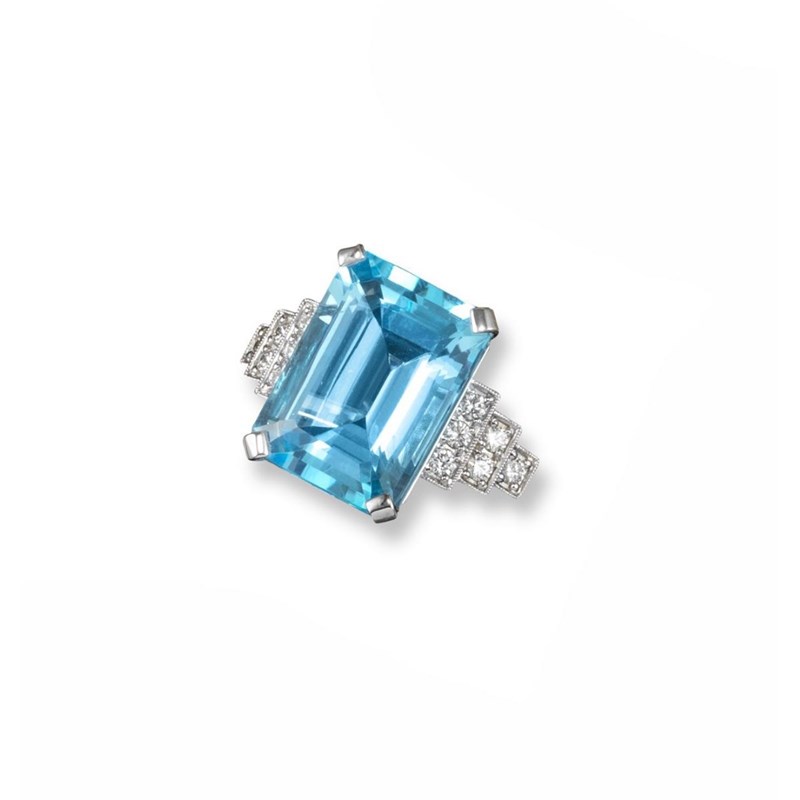 A large blue topaz and diamond set ring, the emerald cut topaz is millegrain set with six circular cut diamonds to each shoulder in 18ct white gold. Size Q.