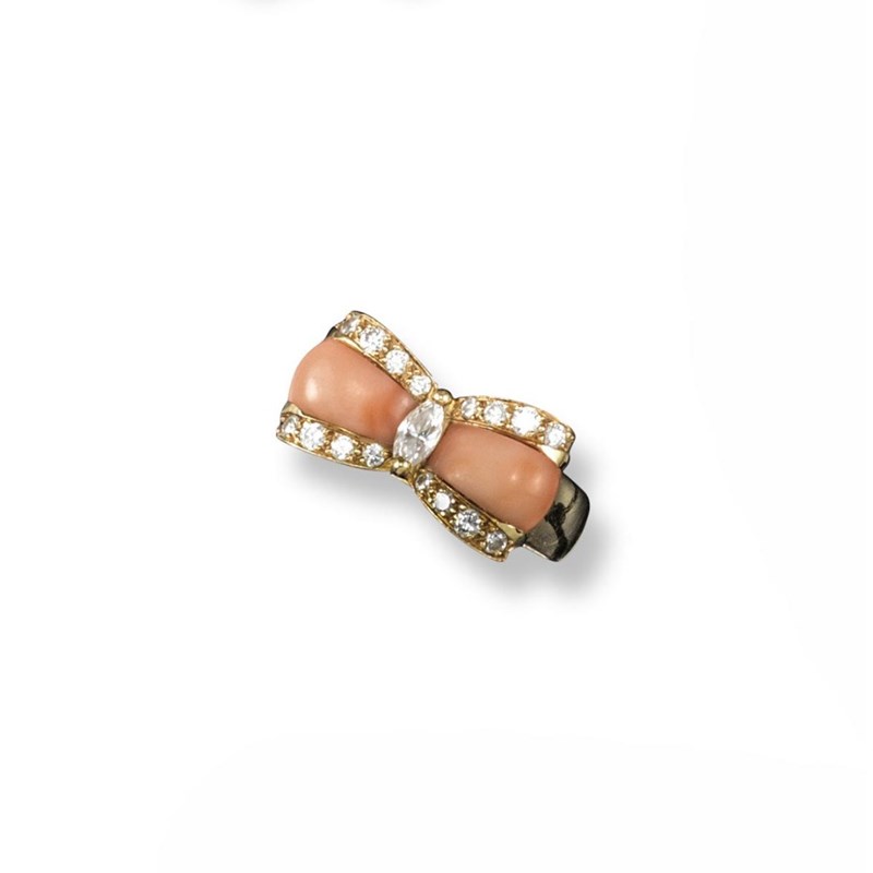 A coral and diamond ring by Van Cleef & Arpels, the stylised bow centred with a marquise-shaped diamond and mounted with pink coral within a border of small circular-cut diamonds in yellow gold. Inventory number NY5K621-76E. Signed VCA, made in France. Exterior French control marks. Size K. Van Cleef & Arpels box.