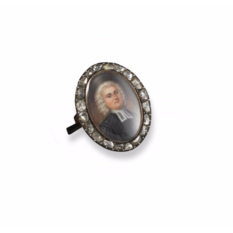 A mid 18th century miniature portrait ring, the glazed portrait realistically depicting Francis Ayscough within an oval surround of rose cut diamonds in closed back silver and gold setting. Size N 1/2.