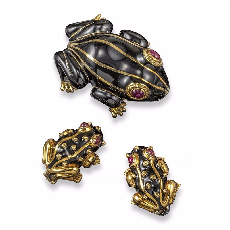 A gold brooch and matching earrings designed as frogs by David Webb. Realistically formed and decorated with black enamel with gold stripes and cabochon ruby eyes. The two earrings with raised pellets. All marked 18k and signed. The brooch 4cm long.