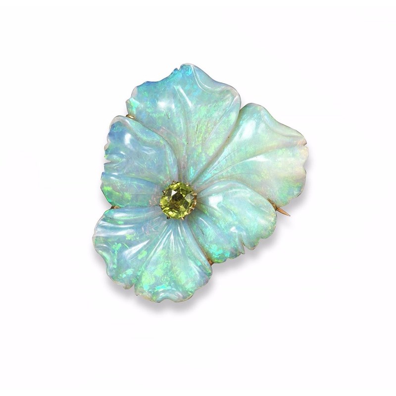 A carved opal and peridot brooch, realistically designed as a pansy with a cushion-shaped peridot to the centre. Mounted in yellow gold. 5cm high.