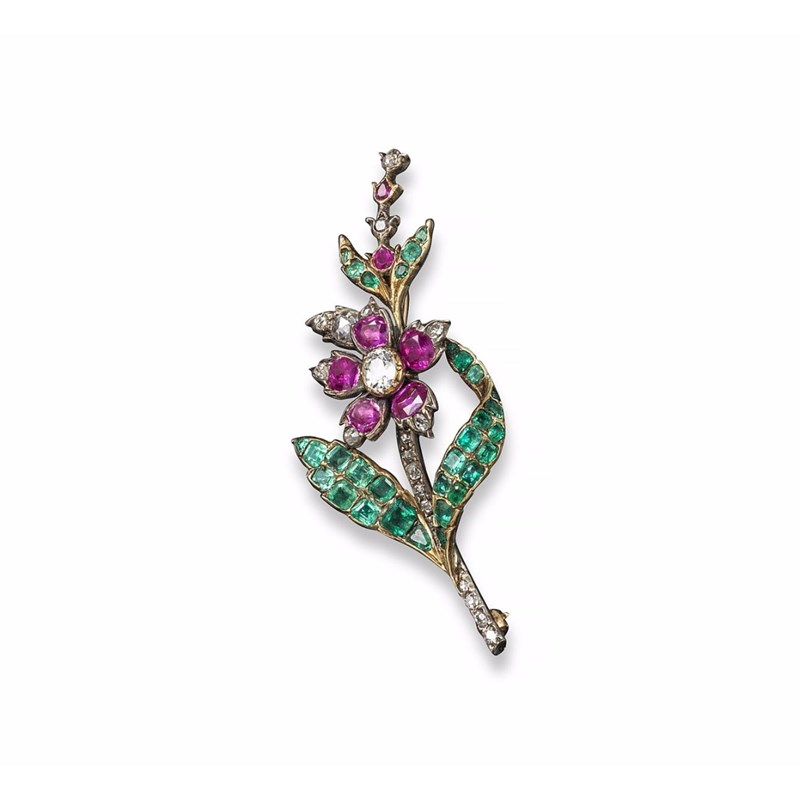 An early 19th century gem-set foliate brooch, realistically formed as a flower sprig set with ruby petals, diamonds and emerald leaves. In closed-back silver and gold mount. 6.5cm long.