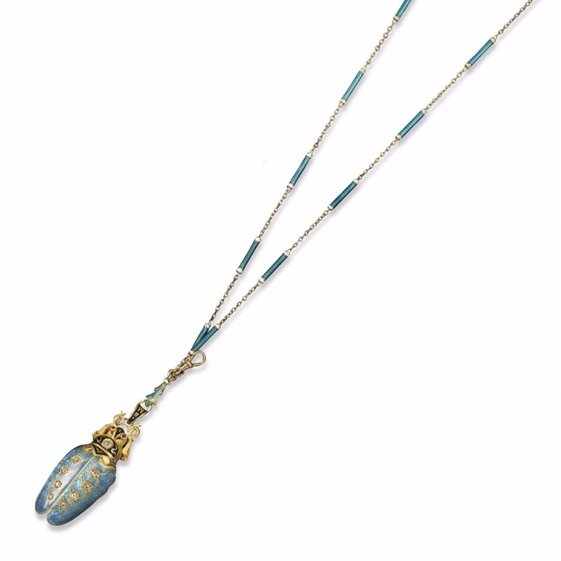 An early 20th century gem set gold and enamel insect watch pendant, realistically formed, the hinged folding wings set with graduated circular cut diamonds on light blue guilloche enamel ground. With black enamel decoration to the head and set with a circular cut diamond and ruby eye. Stem wind movement, white circular dial with blue Arabic numerals and red '12'. 4.5cm long. With a gold fine link chain mounted with blue guilloche and white enamel cylinder links. The chain 56cm.