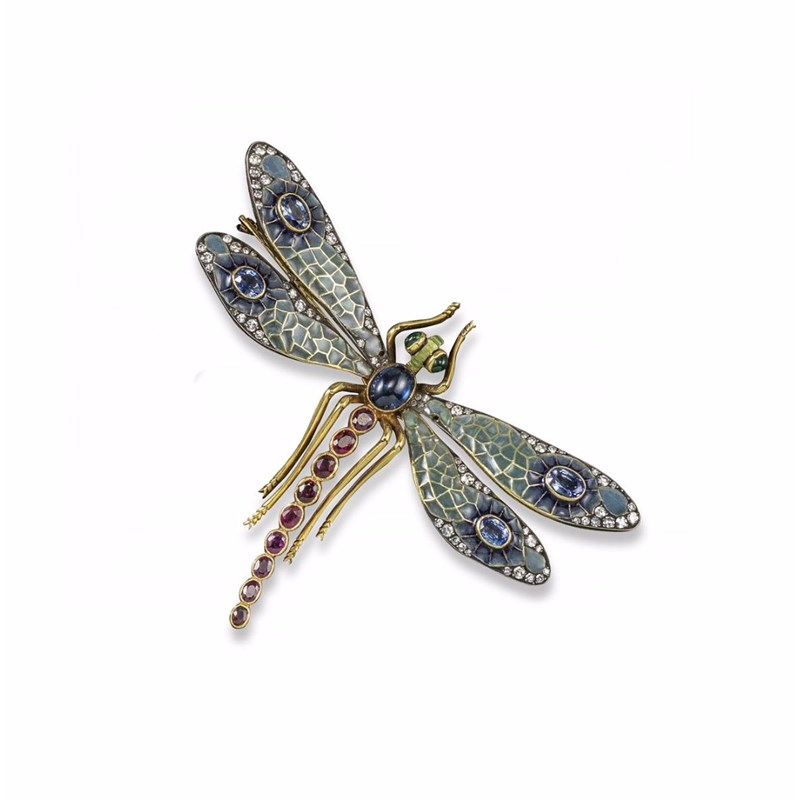 A dragonfly brooch, each plique-à-jour enamel wing set with an oval shaped sapphire and with emerald eyes, cabochon sapphire body and line of graduated oval-shaped garnets. 9cm wide.
