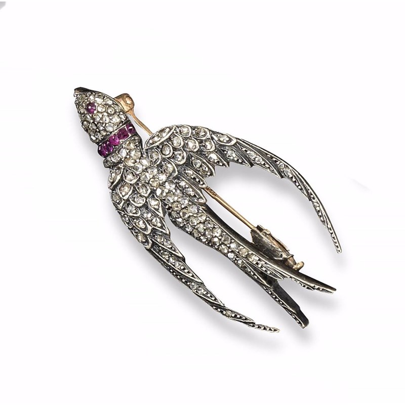 A diamond-set swallow brooch, realistically designed and pave-set with circular-cut diamonds and a ruby collar and eye, in silver and gold. 4.5cm wide.