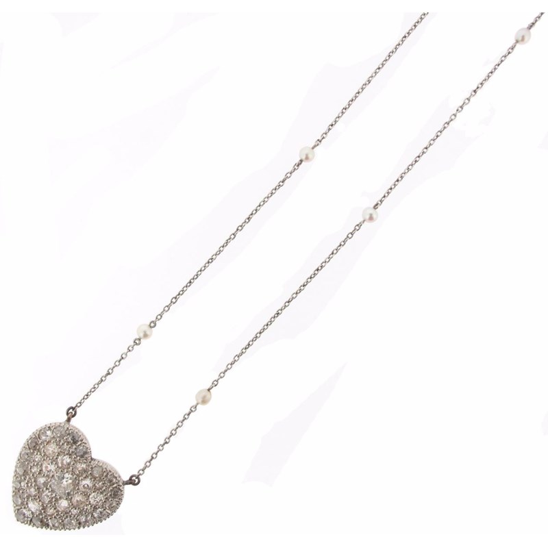 A diamond-set heart shaped pendant, pavé-set with graduated old circular cut diamonds in silver and gold. Removable glazed locket section to the reverse, with a fine link platinum neck chain set with seed pearls. The pendant 2cm wide, the chain 45cm long.