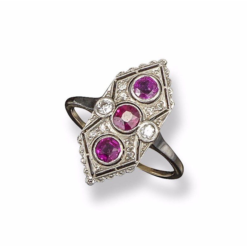 An early 20th century ruby and diamond lozenge-shaped ring