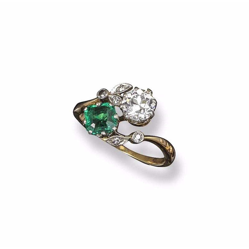 An emerald and diamond cross-over ring