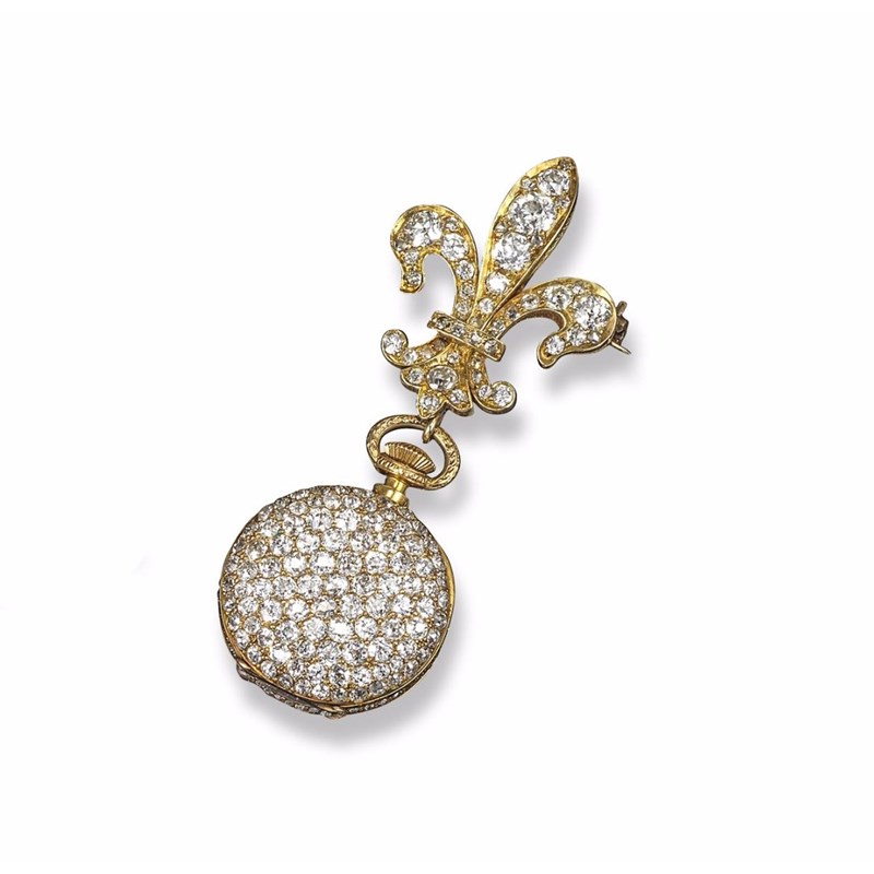 A lady's diamond-set lapel watch by Tiffany & Co, circa 1900. The watch with white enamel dial and black Arabic numerals, signed Tiffany & Co, New York, the case pave-set with circular-cut diamonds in yellow gold. On spinning suspension ring which hangs from a graduated circular-cut diamond gold fleur-de-lys brooch. 6.2cm long. In case by Catchpole & Williams, 14 Grafton Street.