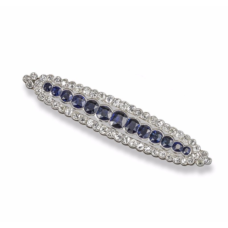 A sapphire and diamond brooch, designed as a line of graduated cushion-shaped sapphires within a border of circular-cut diamonds and further trefoil terminals in white gold. 7.3cm wide.