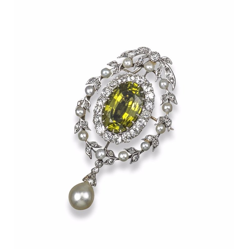 An Edwardian peridot, diamond and pearl brooch pendant, the oval shaped peridot is set within a surround of old circular cut diamonds with a border alternately set with diamond-set leaves and pearls. Suspending a larger pearl from a diamond-set (one missing) cap. 5.5cm high.