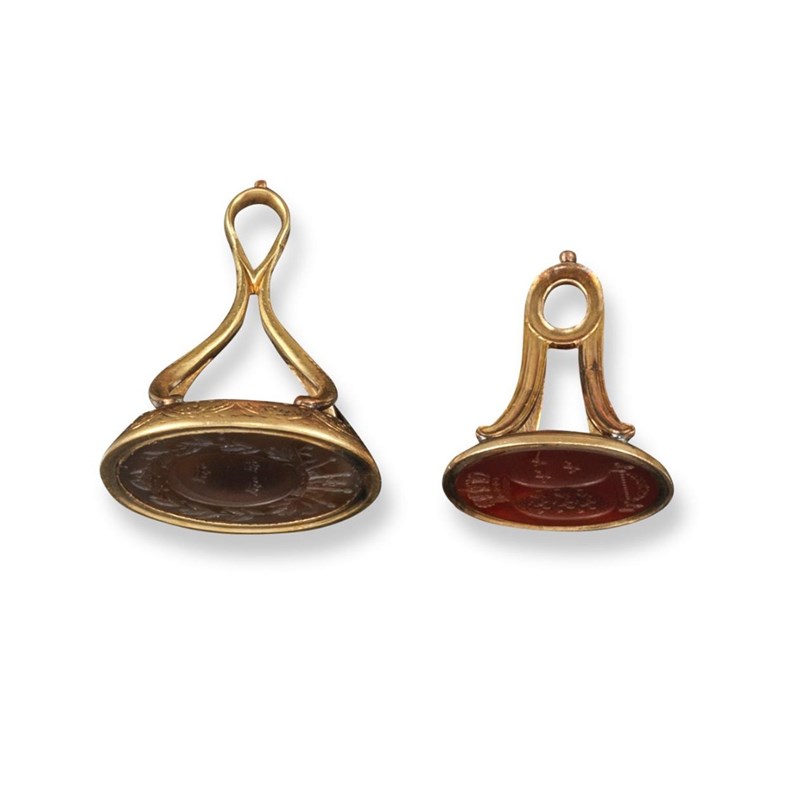 An early 19th century gold fob seal, the carnelian matrix engraved with the arms of the King of Denmark. 3cm high. And a late 18th century gold fob seal mounted with a carnelian matrix engraved with the arms of the King of Denmark. 2.3cm high.