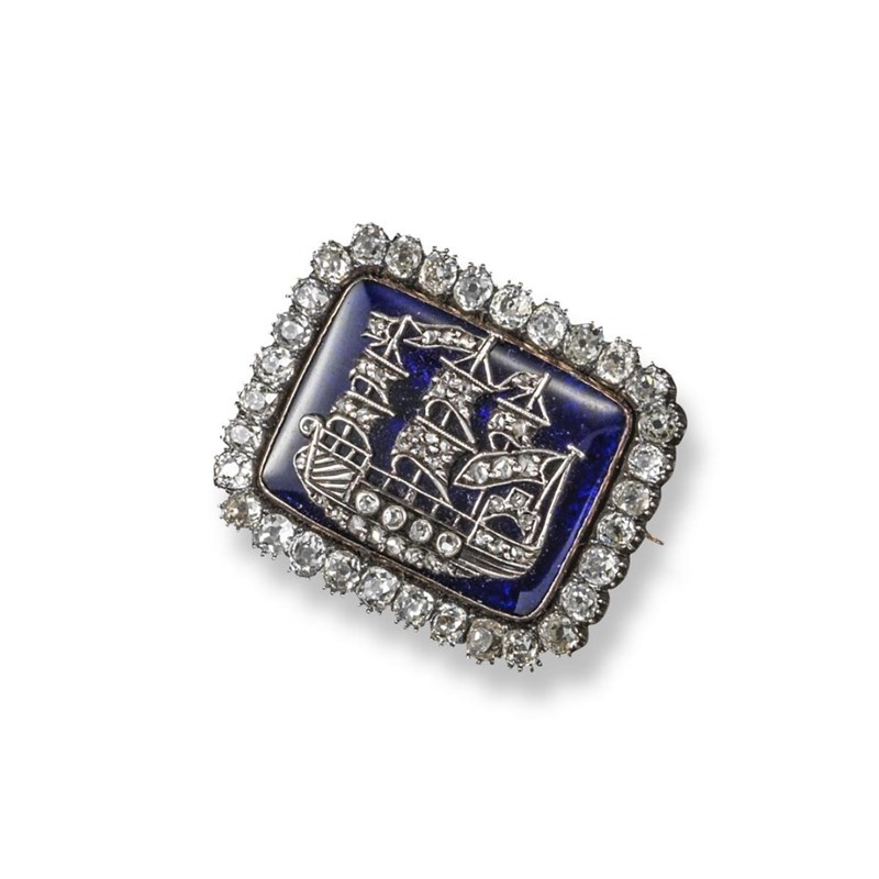 A George III enamel and diamond brooch, the rectangular guilloche enamel panel is mounted with a diamond set galleon, set within a border of old cushion-shaped diamonds in silver and gold. 3.2cm wide.