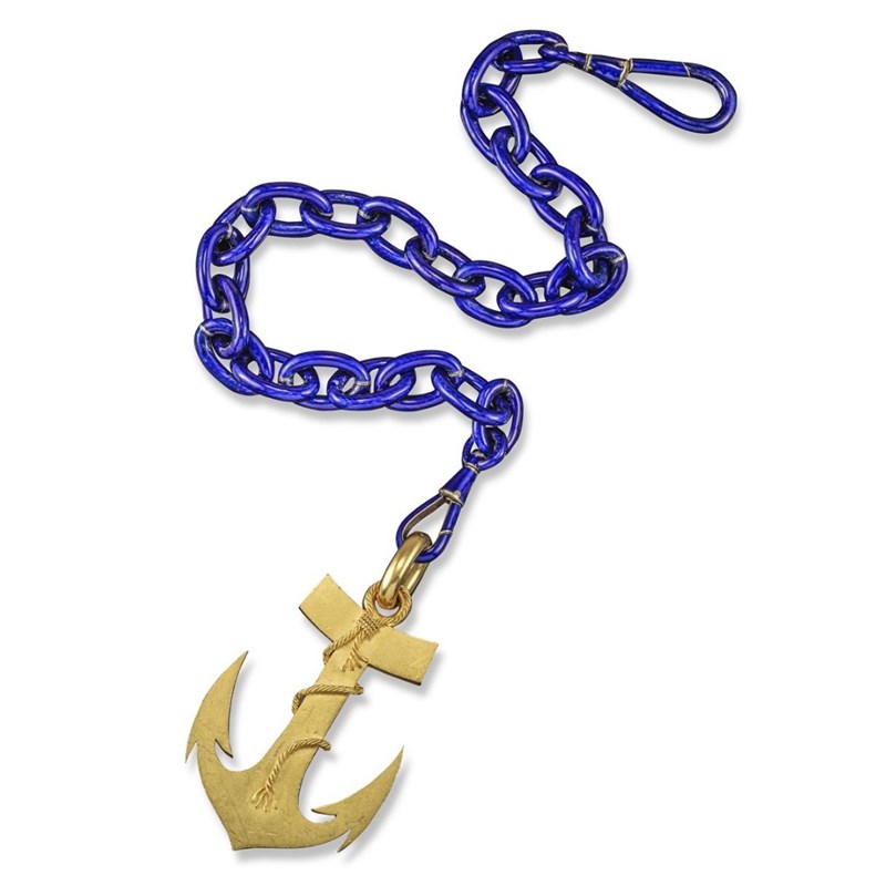 A realistically formed late 19th century gold fouled anchor pendant with a blue enamel and gold matched oval link watch chain, the anchor with broken rope and oval glazed locket compartment to the reverse and with polished gold bale. 6.5cm high.