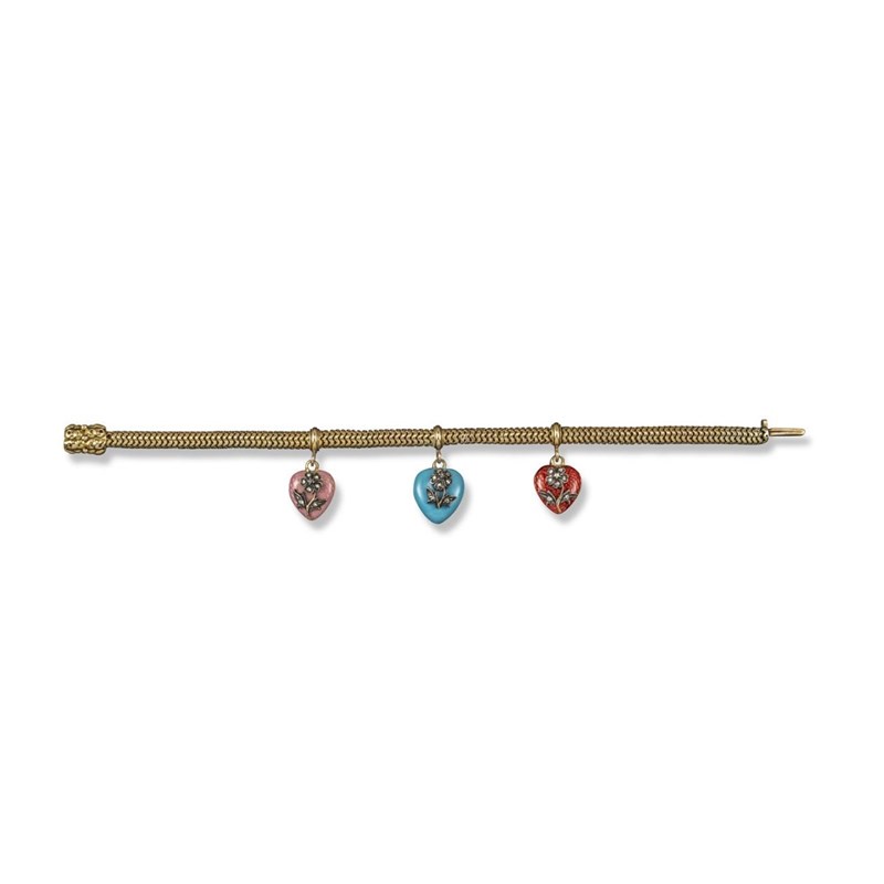 A Victorian gold snake-link bracelet, the bracelet suspends three gold and enamel hearts, the hearts individually applied with pink guilloche enamel, red guilloche enamel and blue enamel, and each applied with a diamond set forget me not. With glazed locket compartments to reverse, containing hair, one dated 1889. 18.3cm long.