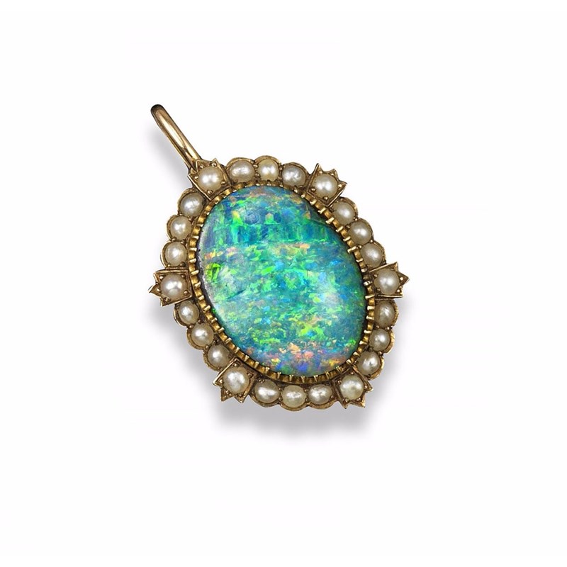 An early 20th century boulder opal and seed pearl brooch pendant, the solid opal is set within a surround of seed pearls in yellow gold. 3.3cm long.