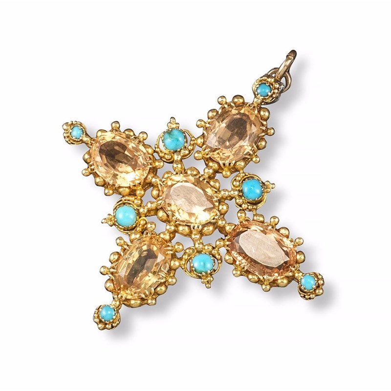 A 19th century turquoise and topaz cross pendant, set with five oval-shaped orange topaz and eight turquoise cabochons in gold cannetille mount. 5.5cm high.