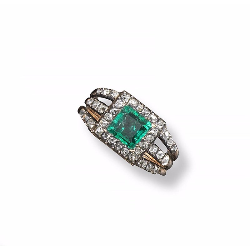 A George III emerald and diamond cluster ring, the square-shaped emerald is set within a surround of cushion shaped diamonds within trifurcated diamond shoulders in closed back silver and gold mount. Size K. Case.