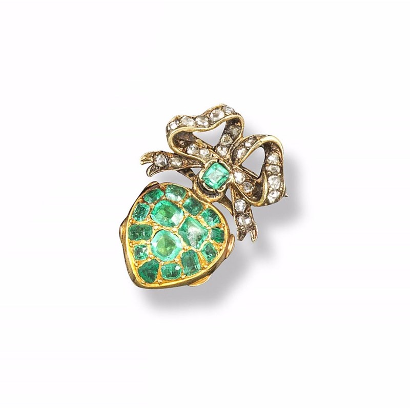 A Victorian emerald and diamond heart shaped brooch, the diamond-set bow suspends an emerald set heart with hinged glazed locket containing hair. Foliate engraved detail to reverse and set in silver and gold. 2.2cm long.