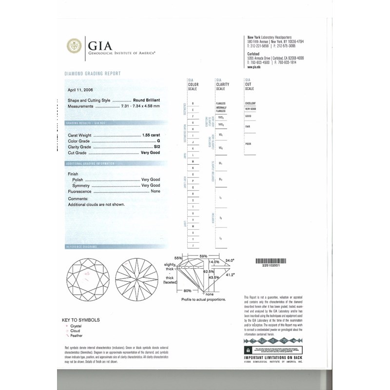 Accompanied by report number 14986847dated 11th April 2006 from GIA stating that the round brilliant cut diamond weighs 1.55cts with G colour, SI2 clarity, no fluorescence.