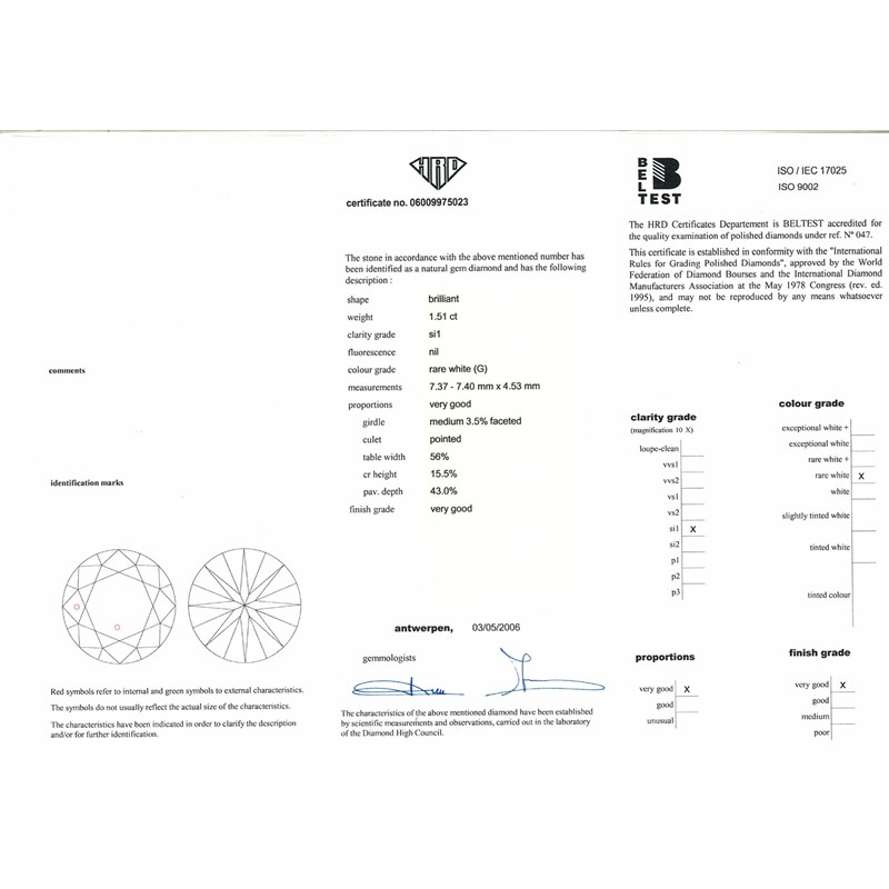 Accompanied by report number 06009975023 dated 3rd May 2006 from HRD, Antwerp stating that the round brilliant-cut diamond weighs 1.51cts with G colour, SI1 clarity, no fluorescence.