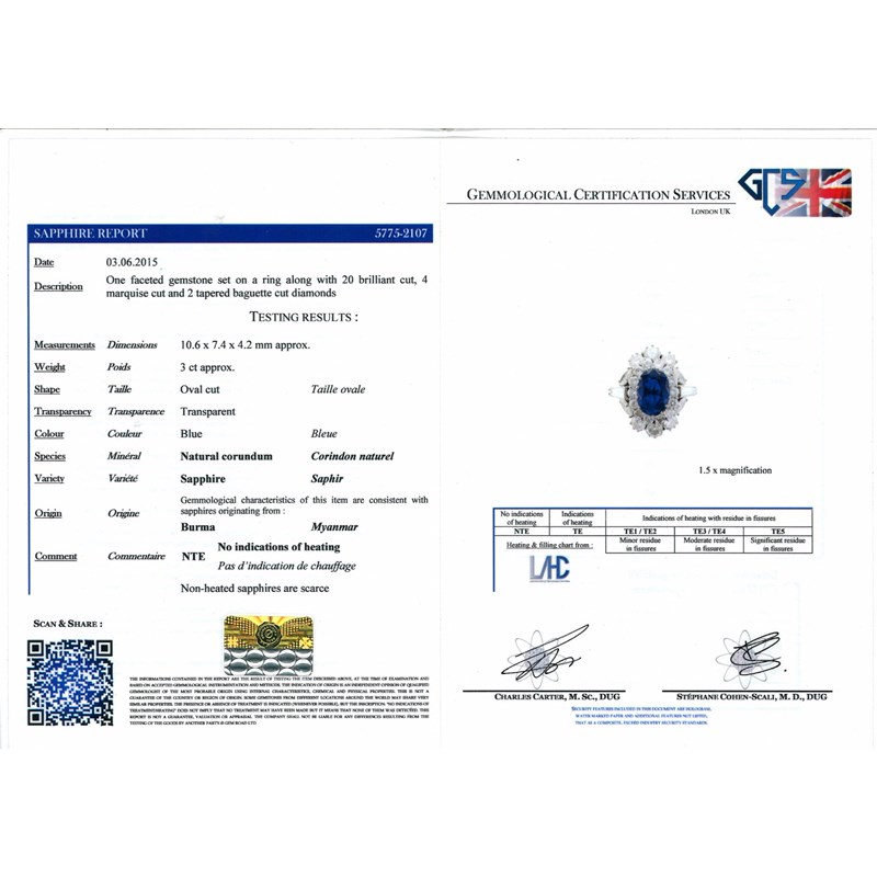 Accompanied by report number 5775-2107 dated 3rd June 2015 from GCS, London stating that the oval-shaped sapphire measures 10.6 x 7.4 x 4.2mm, weighs approximately 3.00cts and is a natural sapphire with no indication of treatment. Origin: Burma.