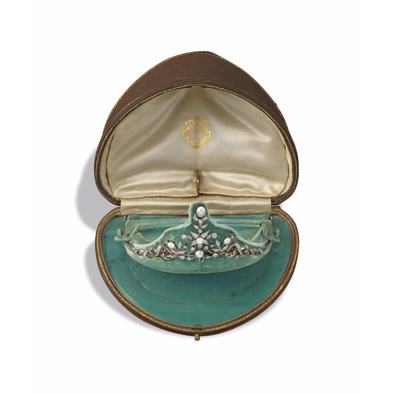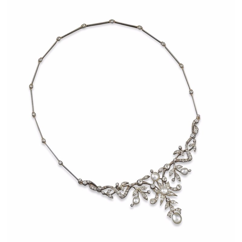 An Edwardian diamond and natural pearl set tiara converting to a necklace