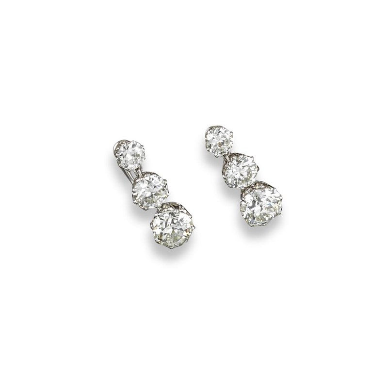 A pair of diamond drop earrings, each earring set with three graduated round brilliant cut diamonds in white gold. The principal diamonds weigh approximately 1.15 and 1.20cts and the total weight is approximately 4.60cts.