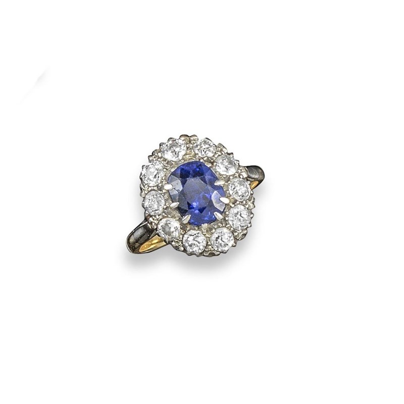 A Burmese sapphire and diamond cluster ring, the oval-shaped sapphire is set within a surround of old circular cut diamonds in platinum and gold. Size O½.