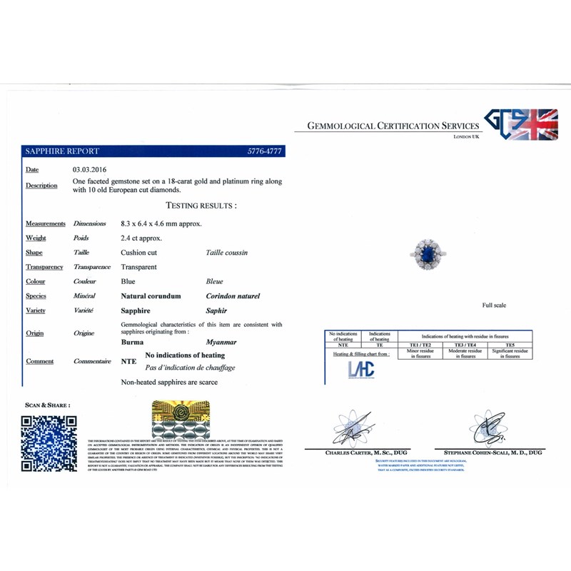 Accompanied by report number 5776-4777 dated 3rd March 2016 from GCS, London stating that the cushion-cut sapphire weighs approximately 2.40cts and is a natural sapphire with no evidence of heating. Origin: Burma.