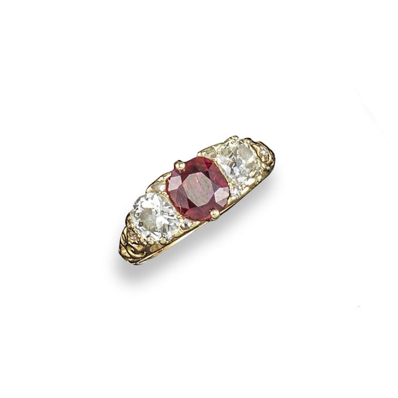A Victorian Burmese ruby and diamond three stone ring, centred with a cushion-shaped ruby with two cushion-shaped shoulder diamonds in yellow gold. With inscription dated 1869. Size M.
