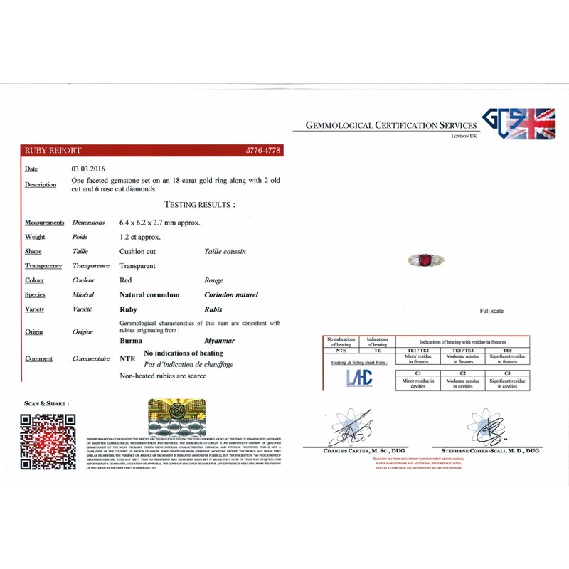 Accompanied by report number 5776-4778 from GCS London dated 3rd March 2016 stating that the cushion-cut ruby weighs approximately 1.20cts and is a natural ruby, with no evidence of heating. Origin: Burma.