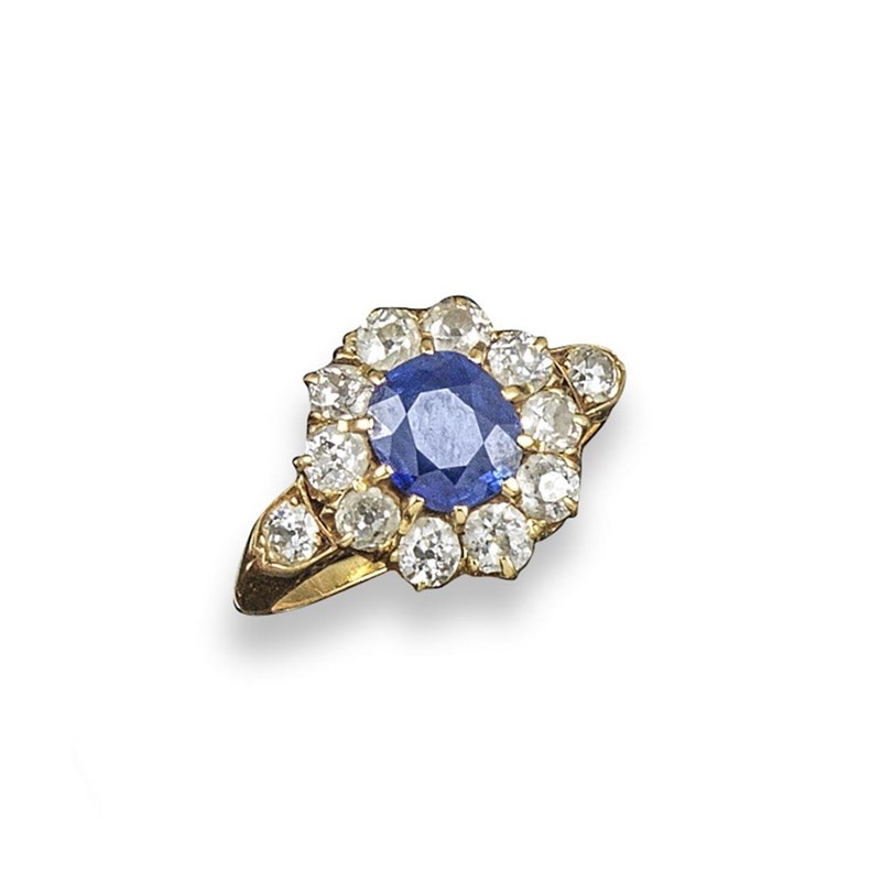 A sapphire and diamond cluster ring, the oval-shaped sapphire is set within a surround of old cushion-shaped diamonds in yellow gold. Size N 1/2.