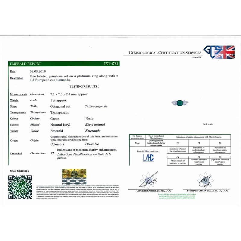 Accompanied by report number 5776-4782 dated 3rd March 2016 from GCS, London stating that the emerald-cut emerald weighs approximately 1.00cts and is a natural emerald with indications of moderate clarity enhancement. Origin: Colombia.
