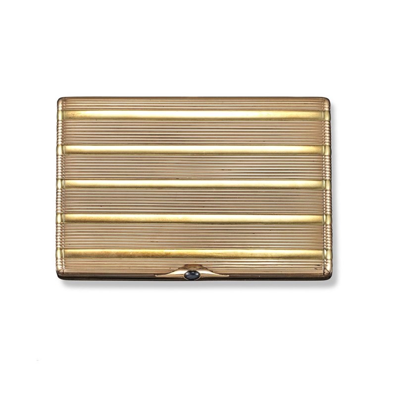 A Russian two-colour gold cigarette case, the strips of finely fluted pink gold extend over the entire exterior and are separated with plain yellow gold bands. The colour pattern extends to the polished interior. Cabochon sapphire thumbpiece. Engraved inside the lid 'Ursula 28.3.1940'.