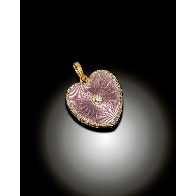 A heart-shaped locket pendant by Fabergé, the gold locket centred with a cushion-shaped diamond with radiating lilac guilloche enamel within a rose cut diamond border. Opening to reveal a vacant circular locket. Plain gold bale.
