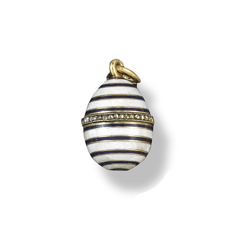 A small gold egg pendant by Fabergé, with a central ring of rose cut diamonds and further gold bordered blue and white enamel rings. The gold bale signed for Henrik Wigström and indistinct zolotnik mark. Damaged. 1.6cm high.