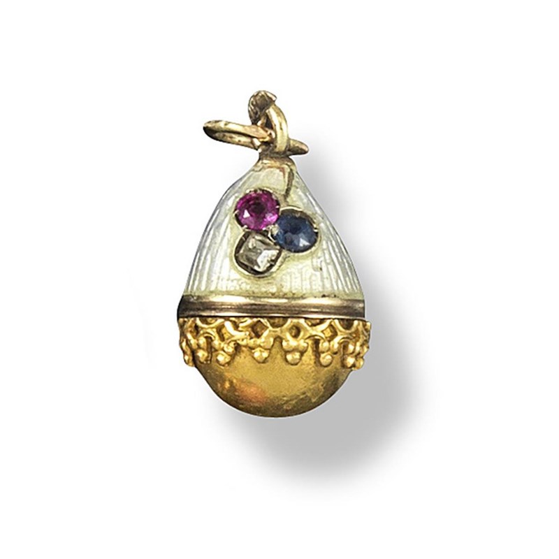 A small gold egg pendant by Fabergé, the upper section with oyster coloured guilloche enamel decoration and set with a small diamond, sapphire and ruby. the gold lower section with fine wirework decoration. The gold bale marked А★Н for August Hollming and 56 zolotnik mark. 1.7cm high.