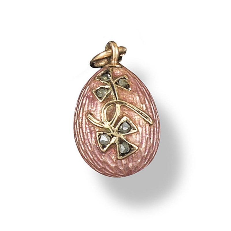 A small gold egg pendant, with pink guilloche enamel decoration and applied with foliate decoration set with rose cut diamonds. The suspension ring stamped А★Н with a 56 zolotnik mark. 1.3cm high.