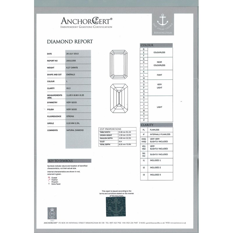 Accompanied by report number 20011055 dated 26th July 2013 from Anchorcert, Birmingham stating that the emerald-cut diamond measures 11.65 x 8.96 x 6.35mm and weighs 6.27cts, with L colour, VS2 clarity. Strong fluorescence.