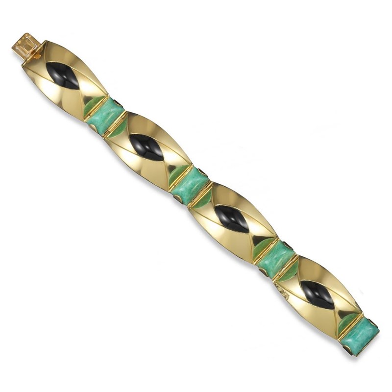 A gold, enamel and amazonite bracelet by Lacloche Frères, the four tonneau-shaped sections designed with a central black enamel lozenge within triangular gold folds, alternately-set with sugarloaf amazonites in yellow gold. Signed Lacloche Frères Paris and with French control marks. 19cm long.