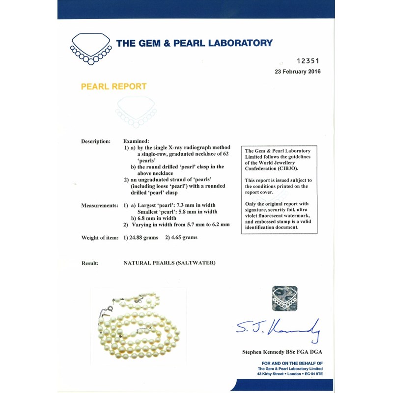 Accompanied by report number 12351 dated 23rd February 2016 from The Gem and Pearl Laboratory, London stating that the pearls graduate from 5.7 to 7.3mm and are natural saltwater pearls. Total weight 29.53g including clasp and loose pearls.
