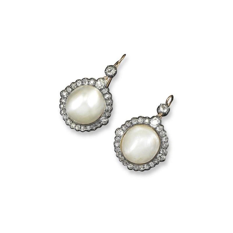 A pair of natural saltwater blister pearl and diamond earrings, the large blister pearls are set within a surround of cushion-shaped diamonds and suspend from a further diamond in silver and gold closed back settings. 2.5cm wide.