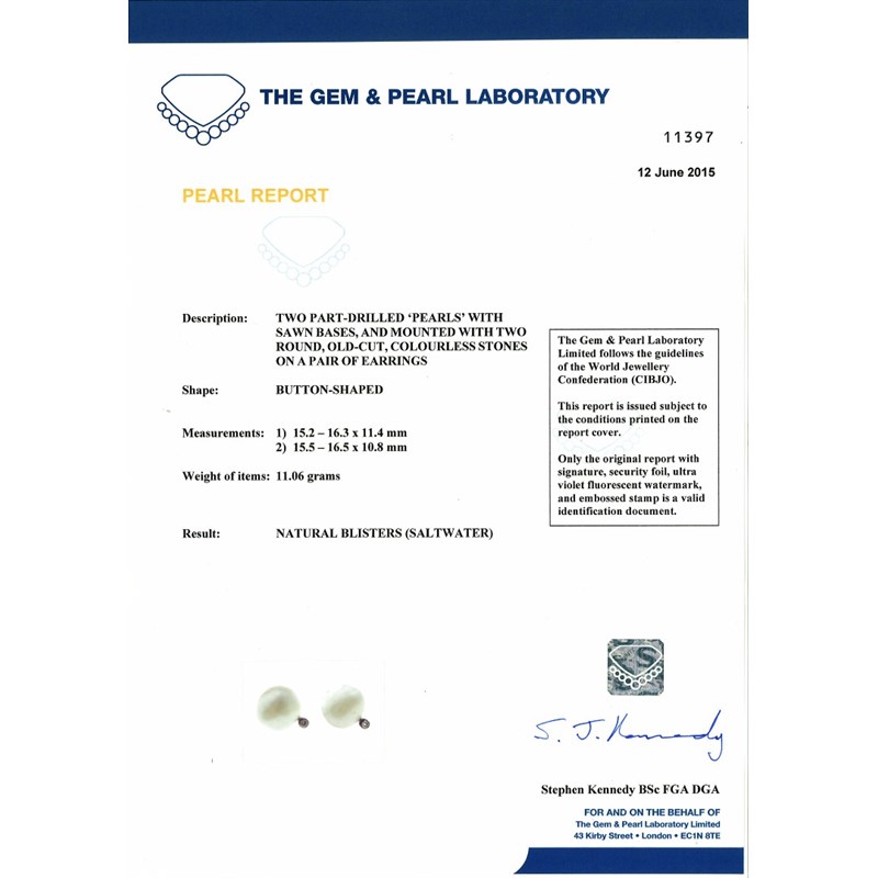Accompanied by report number 11397 dated 12th June 2015 from The Gem and Pearl Laboratory, London stating that the button-shaped blister pearls measure 15.2 - 16.3 x 11.4mm and 15.5 - 16.5 x 10.8mm and are natural saltwater blister pearls.