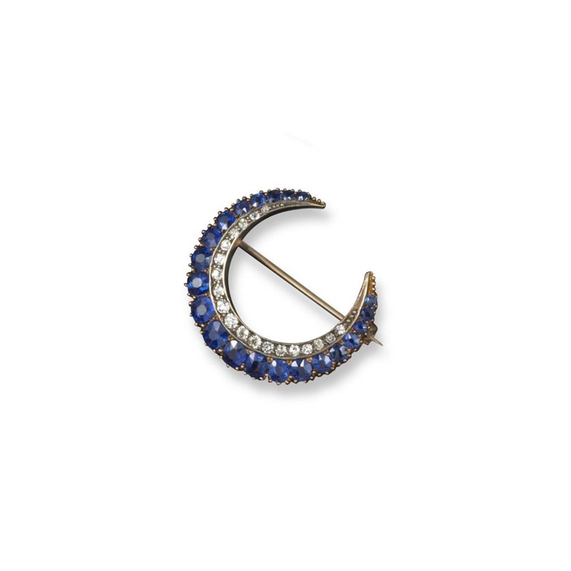 A late Victorian sapphire and diamond closed crescent brooch, set with an outer line of cushion-shaped sapphires and an inner line of circular-cut diamonds in silver and gold. 3cm wide. Case